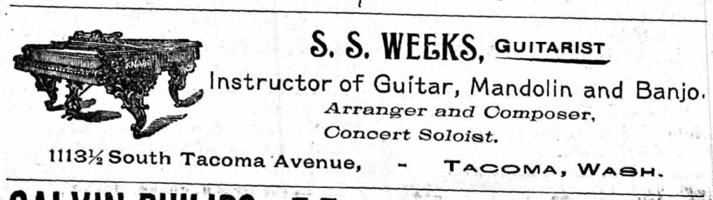 Weeks was clearly a significant musician of his era, and left his mark as both a performer and a composer. But what is his connection to Tacoma? Biographical profiles of Weeks – which appear frequently in mandolin-themed corners of the internet – often include a phrase along the lines of “and he led a mandolin and guitar orchestra in Tacoma, Washington,” but without further detail. That was enough to get this Tacoma researcher intrigued!