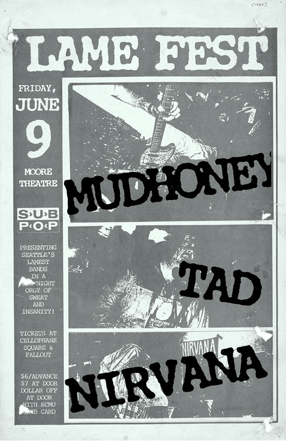 Here’s a show poster from Seattle’s Moore theatre for a lineup including Mudhoney, Tad, and Nirvana on June 9th, 1989.