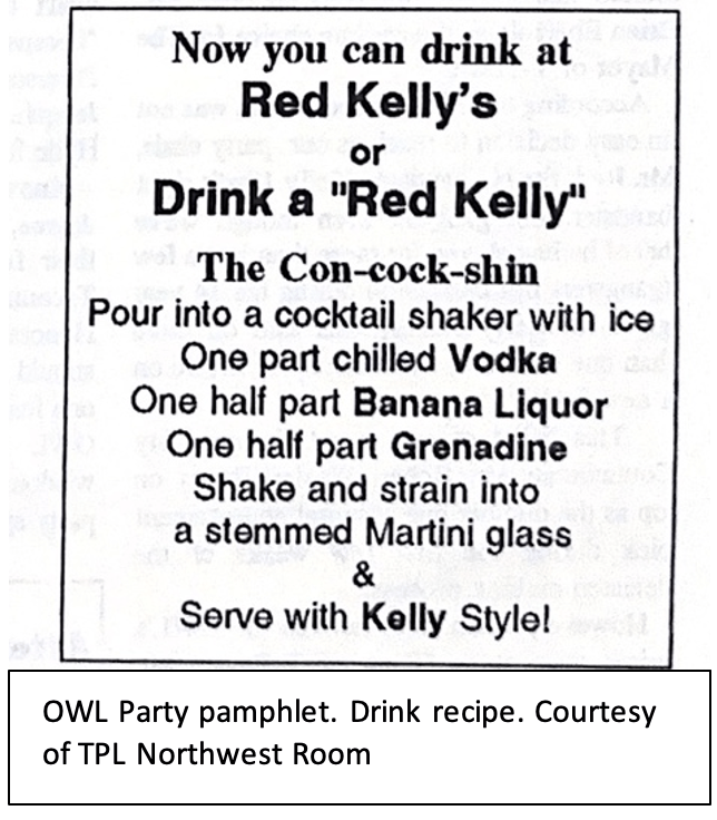 Much to the disappointment of his Olympia regulars, in 1978, The Tumwater Conservatory closed and Kelly returned to playing gigs in the South Sound. By 1986 though, Red and Donna opened a new club, Kelly’s, located at: 1105 Tacoma Ave. South in Tacoma.